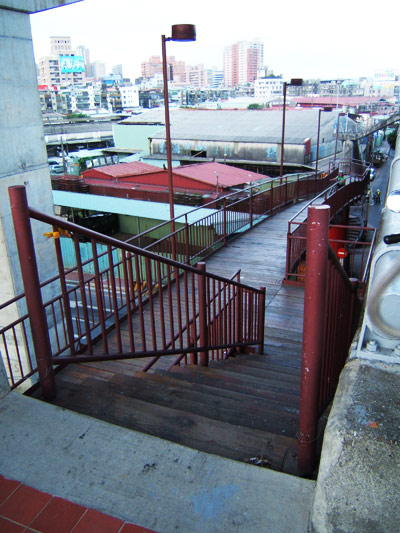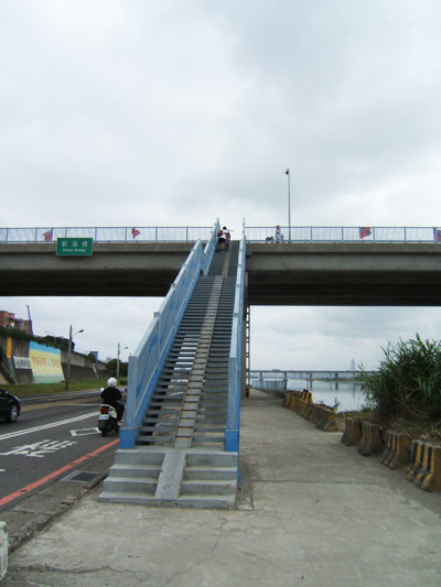 到了板橋這端,引道是圓弧形,木板地面,但下去前有一個階梯,請扛起你的車....